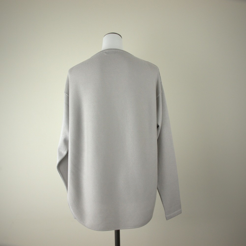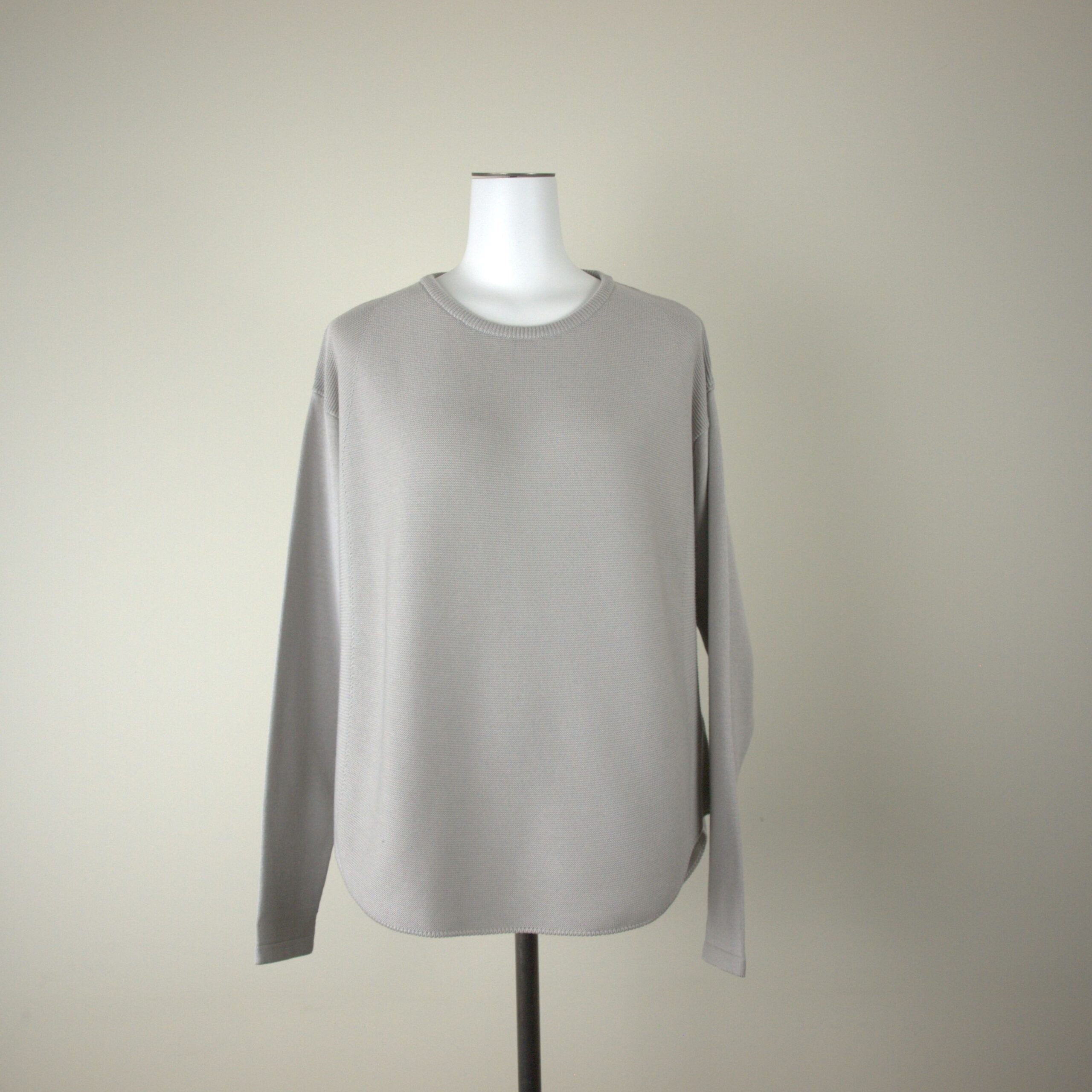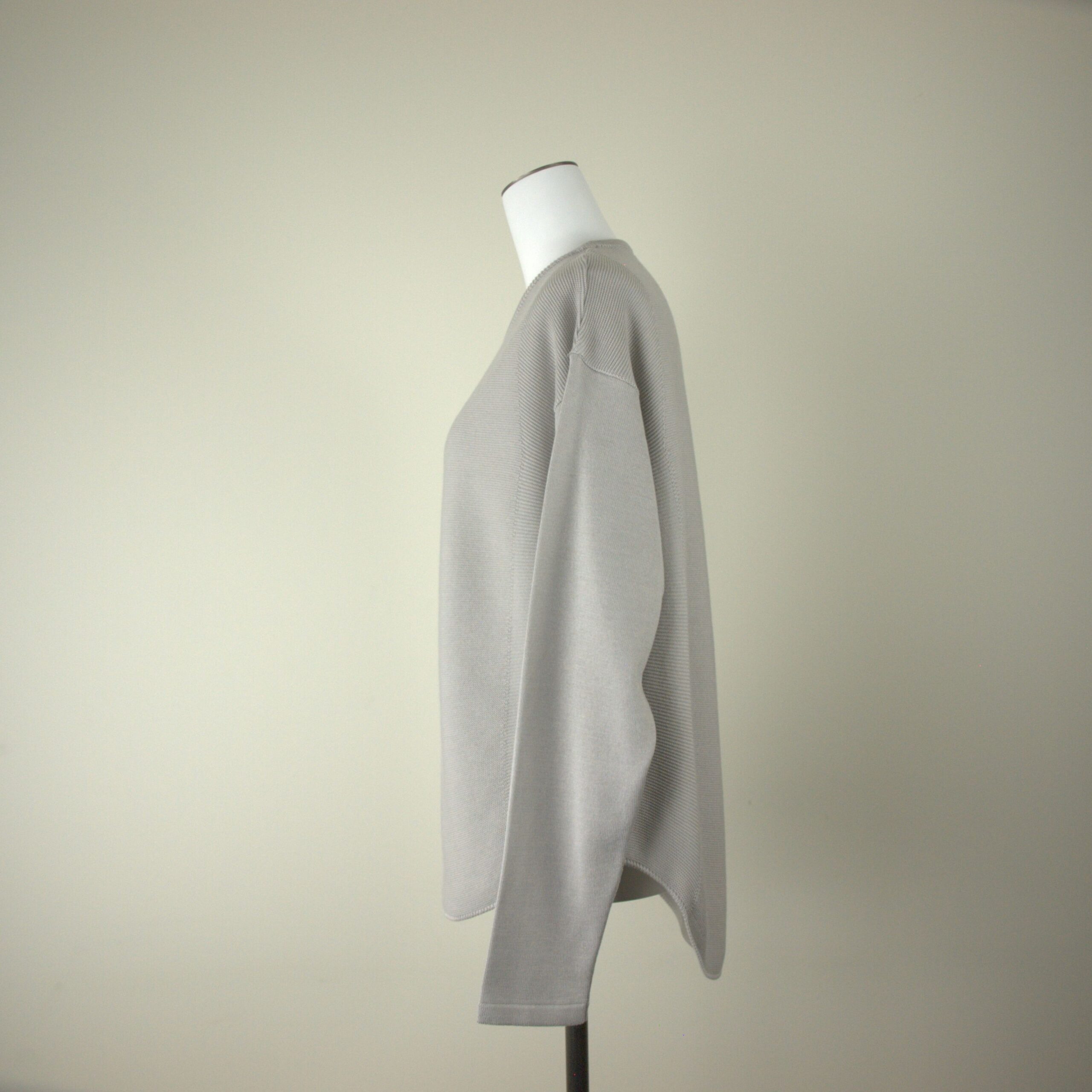 コットン45%モダール45%ウール10% 初秋対応の糸使用。変わりガーター編みでホールガーメント。裾のラウンドヘムが美しいクルーセーター。