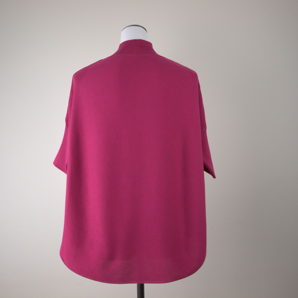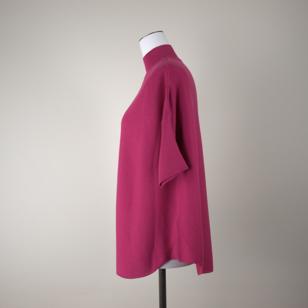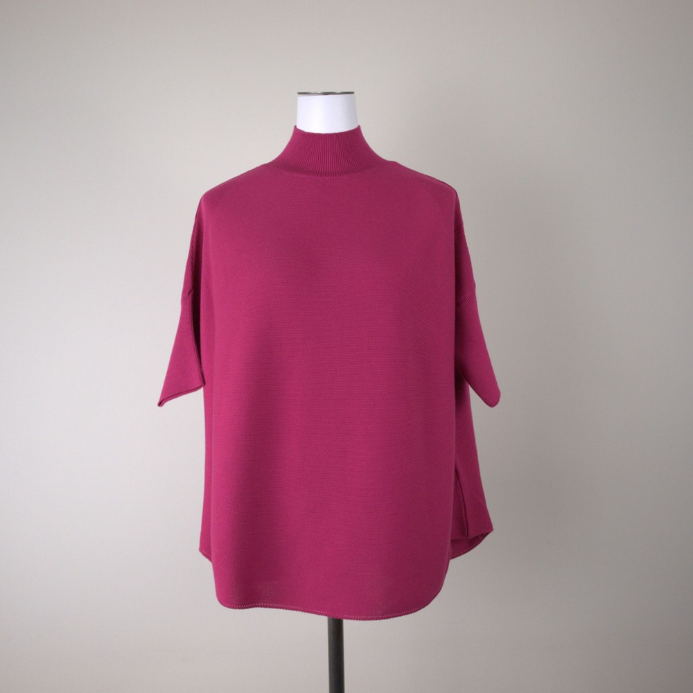 コットン45%モダール45%ウール10% 初秋対応の糸使用。変わりガーター編みでホールガーメント。裾のラウンドヘムが美しいハイネックセーター。