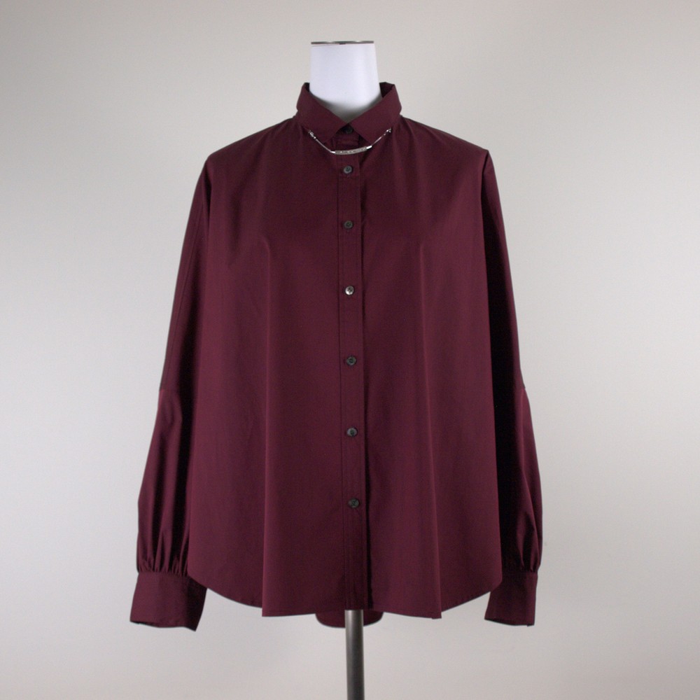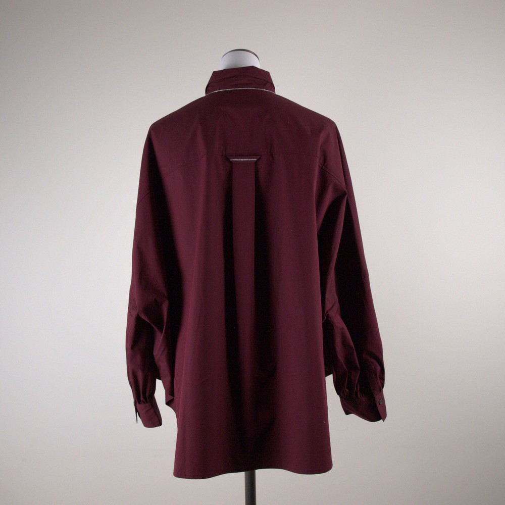 少し光沢のある高密度で織りあげたタイプライターをバイオ加工でナチュラル感のある風合いに仕上げた素材使用。ワイドな身幅に袖口ギャザーをあしらった短めの袖が新鮮なシルエットビックシャツ。初秋の一枚着のデザインシャツ。襟ぐりのオリジナルボールチェーンパーツ(取り外し可)付き。