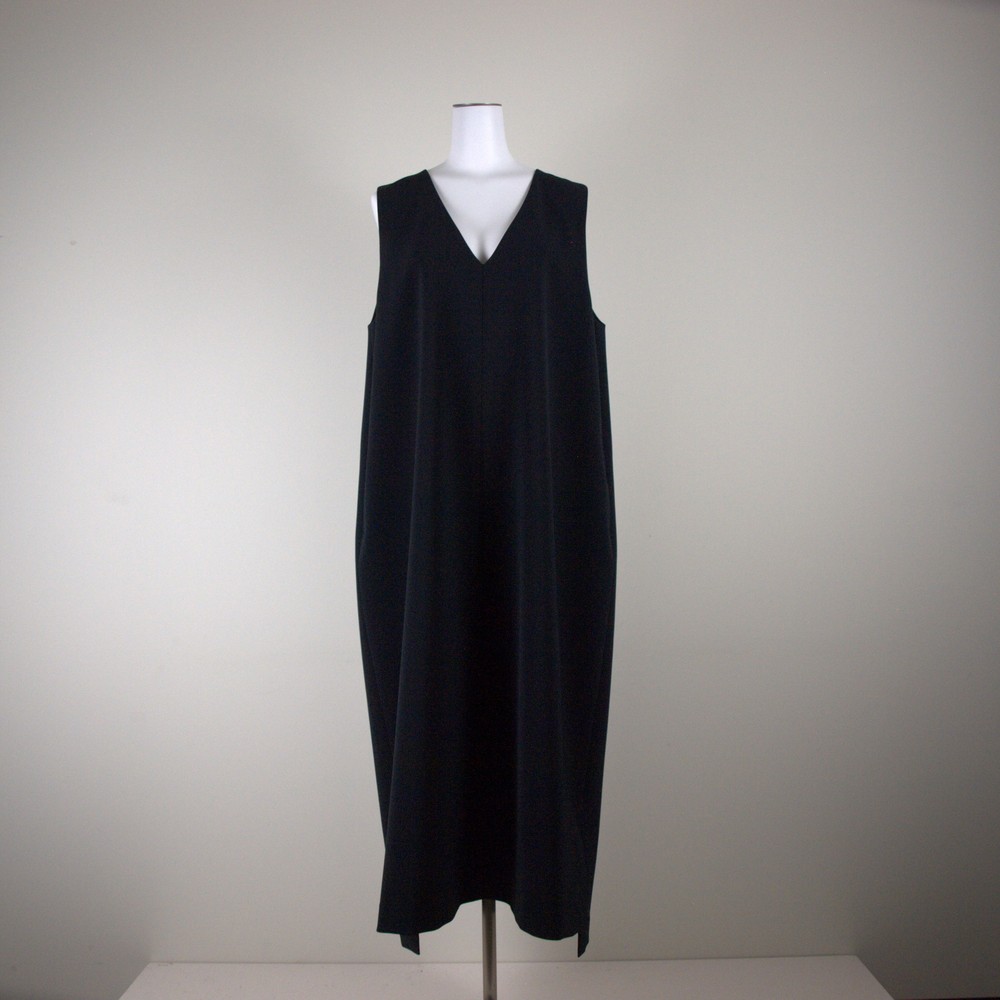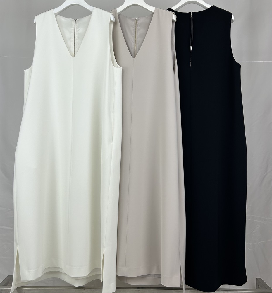 シーンレスな仕立て映えするストレッチダブルクロス使用。膨らみとドレープ性を併せ持った2WAYストレッチ。ボディラインをカバーするVネックジャンバースカート。手洗い・紫外線防止・2WAYストレッチ