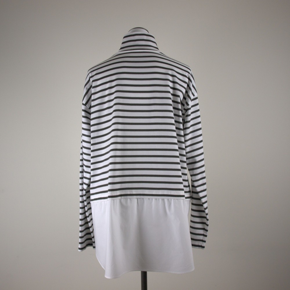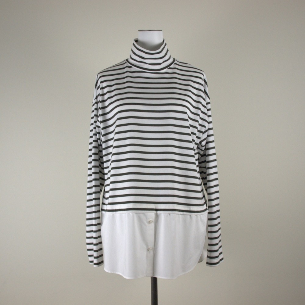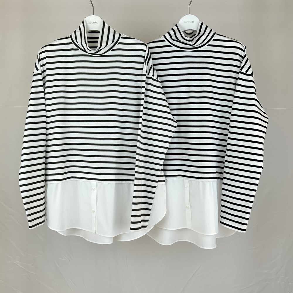 綿100%ボーダーとオーガニックコットンタイプライター組み合わせた高めのハイネックでシャツを着ているようなデザインカットソー。LT4515107とコーディネートできます。
