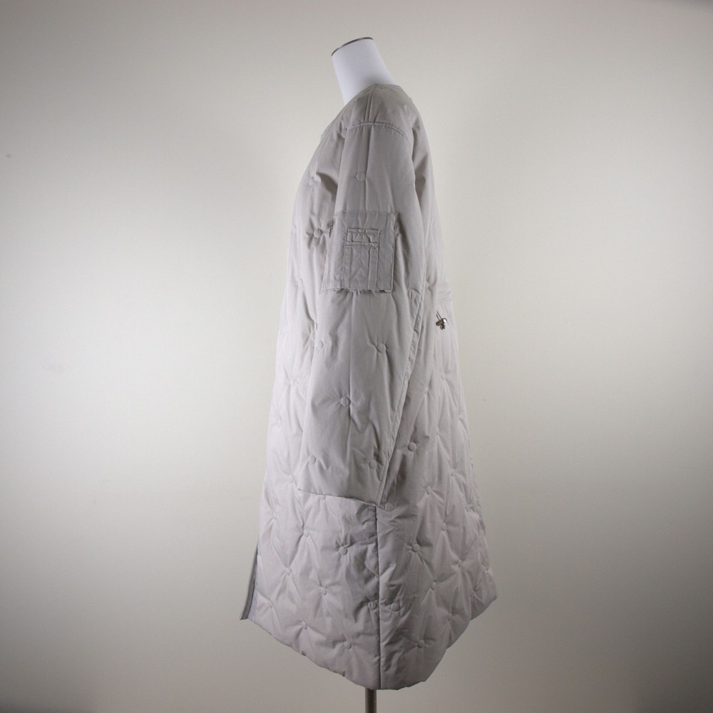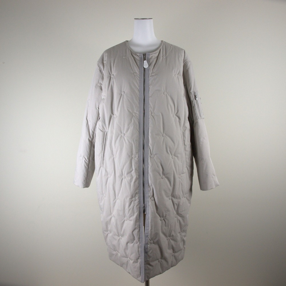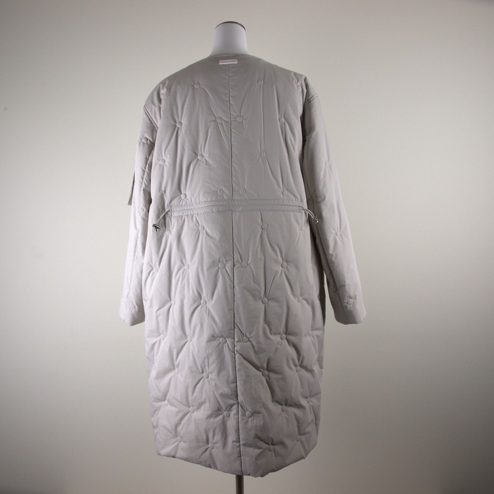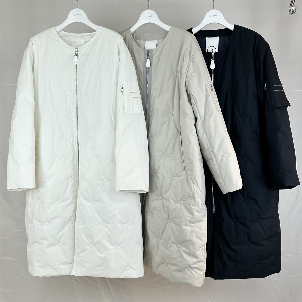 (カタログ掲載)少し光沢のある高密度で織りあげたタイプライターをバイオ加工でナチュラル感のある風合いに仕上げた素材使用したオリジナルドット柄刺繍キルト使用したクルーコート。白いスライダーがアクセント。
