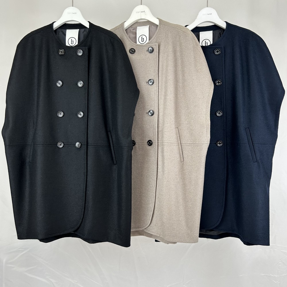 ふわふわのウールリングヤーンを使用した編地に強力圧縮をかけたウールジャージ。リング糸なら出羽の表情があらびきTOPカラーが魅力的な素材を使用した。クラシカルなダブル前のロングベスト。