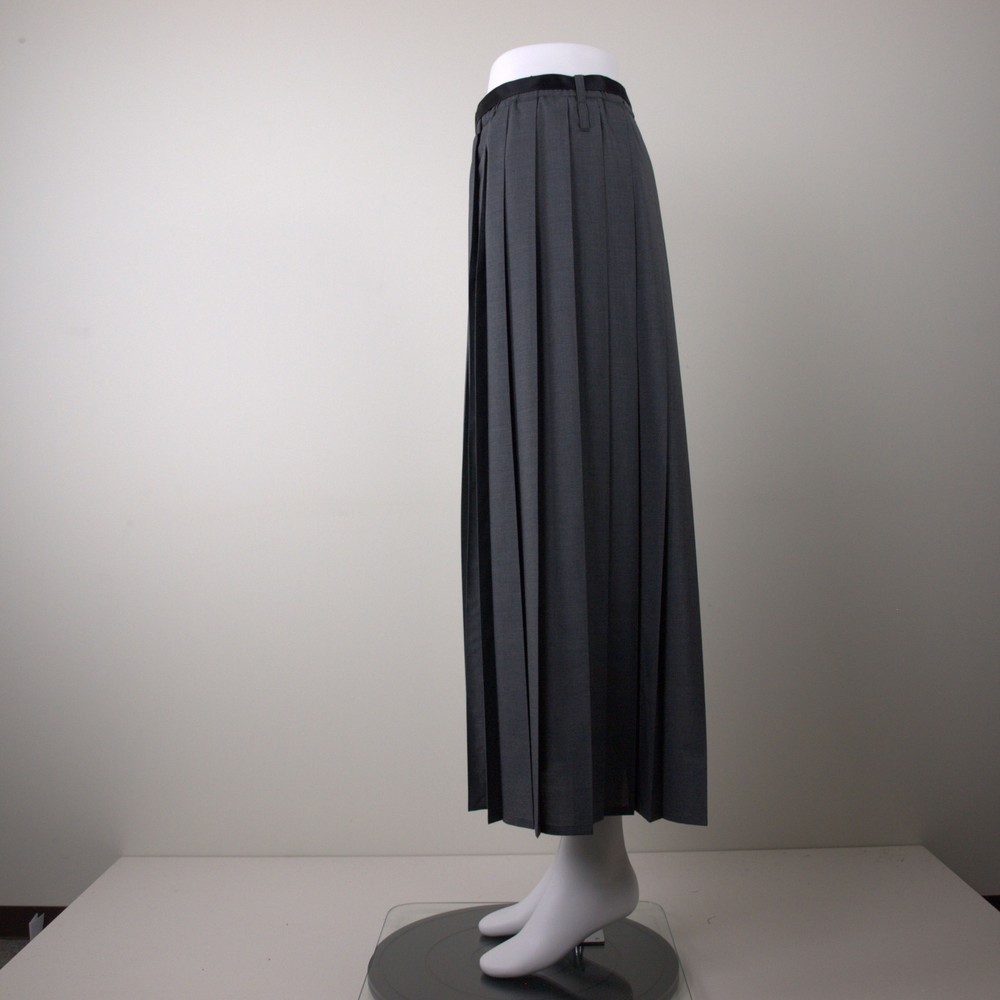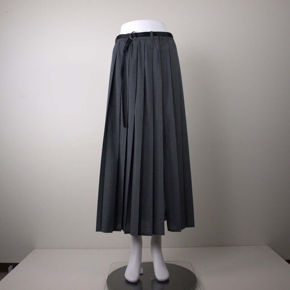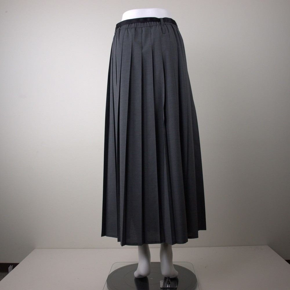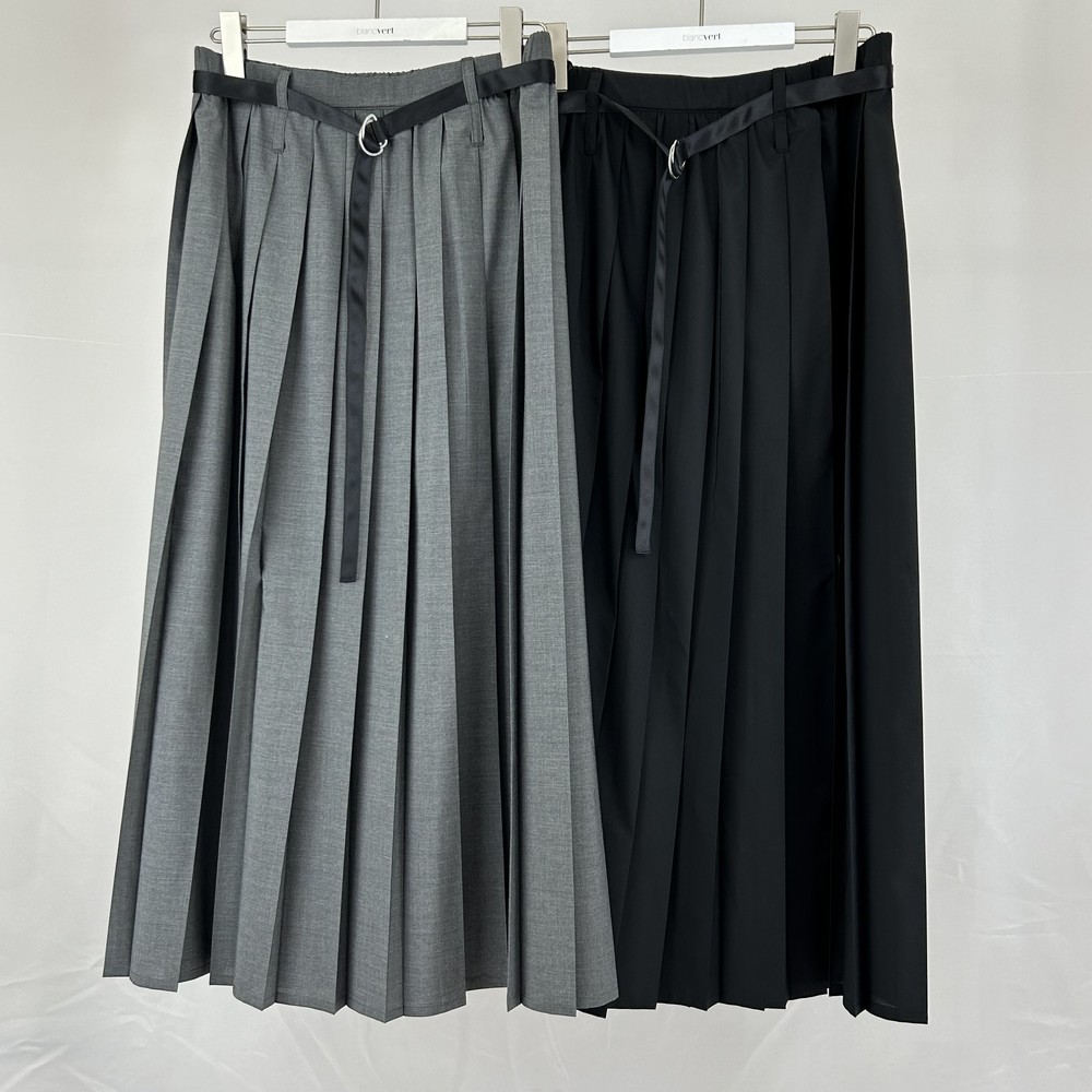しなやかな風合いで毛羽の少ないクリアー表面感と心地よい肌触りが特徴もブロード素材使用。直線的な縦プリーツがクールなイメージのプリーツスカート。左前にある深めのスリットがポイント。