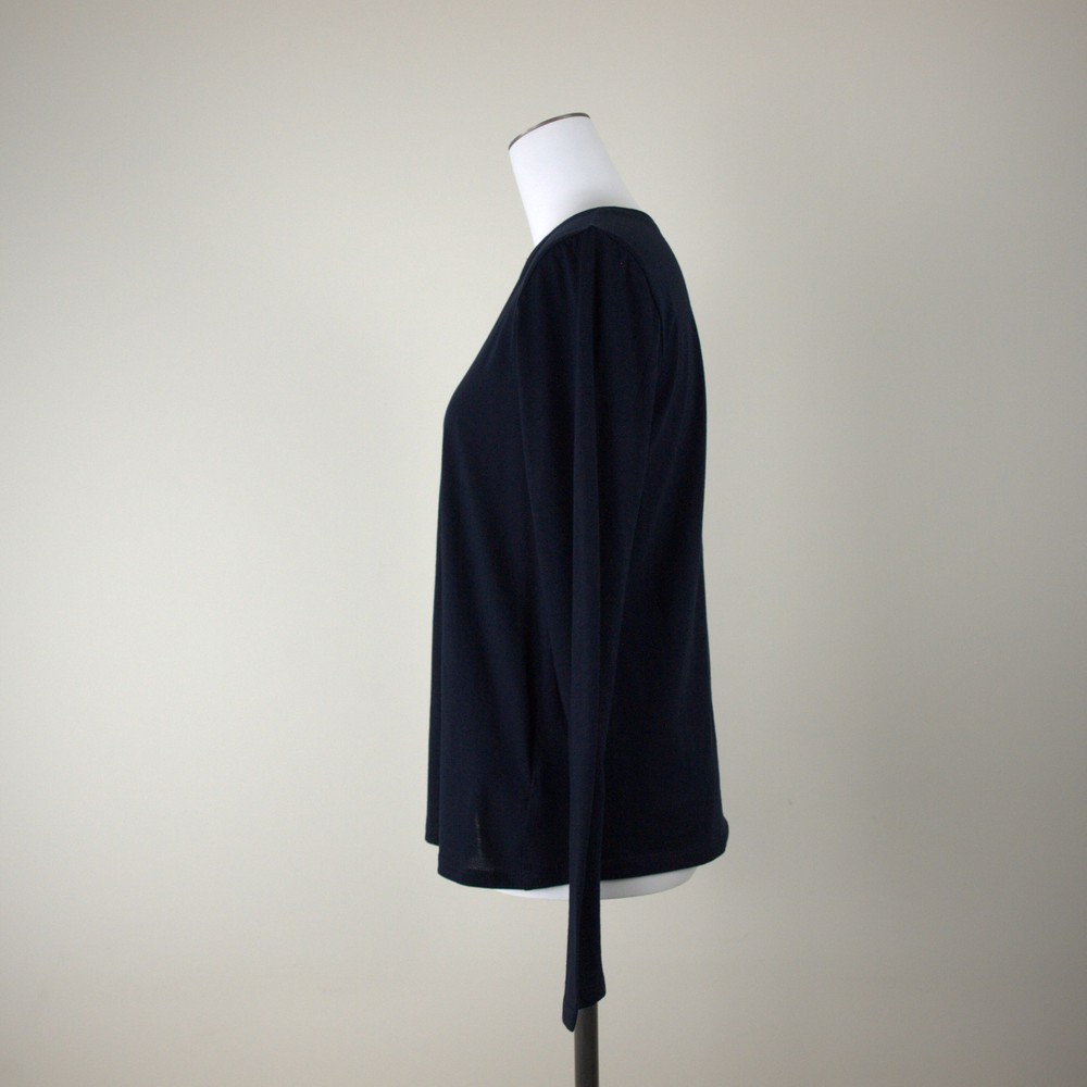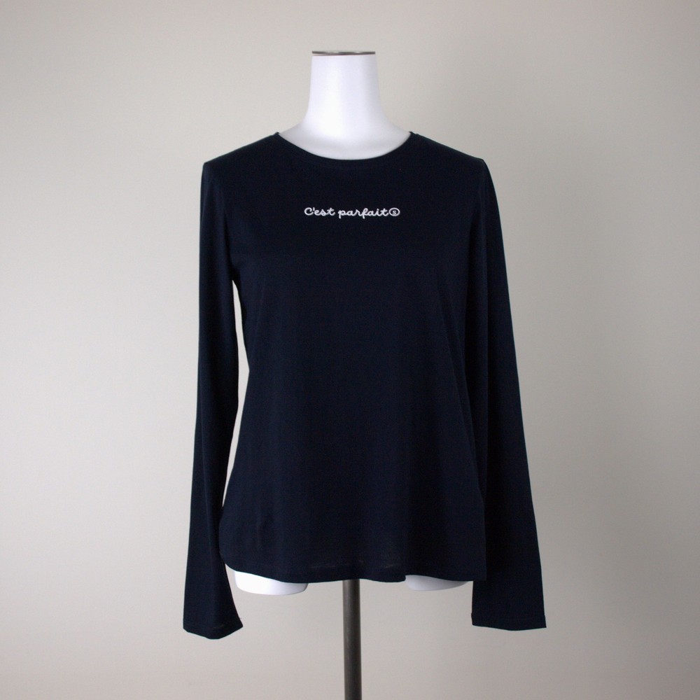 綿カシミヤの細番手ジャージは和歌山森下ジャージメリヤス別注素材・オリジナルカラー。薄手でカシミヤ10%混紡で暖かく肌触りのよいコンフォータブルな着心地。レイヤードスタイルに活躍。チラ見せでオシャレに。胸元のプリントはフランス語で「バッチリだね!」という意味。メッセージ性より遊び心を表現。ノースリーブのワンピースやベストのインナーとして合わせて体に沿ったラインが華奢見せ効果あり。