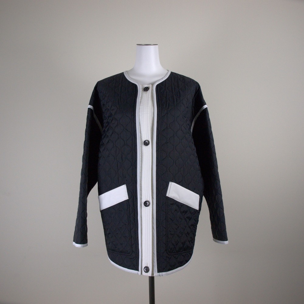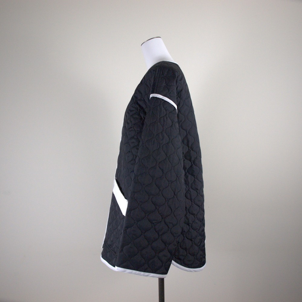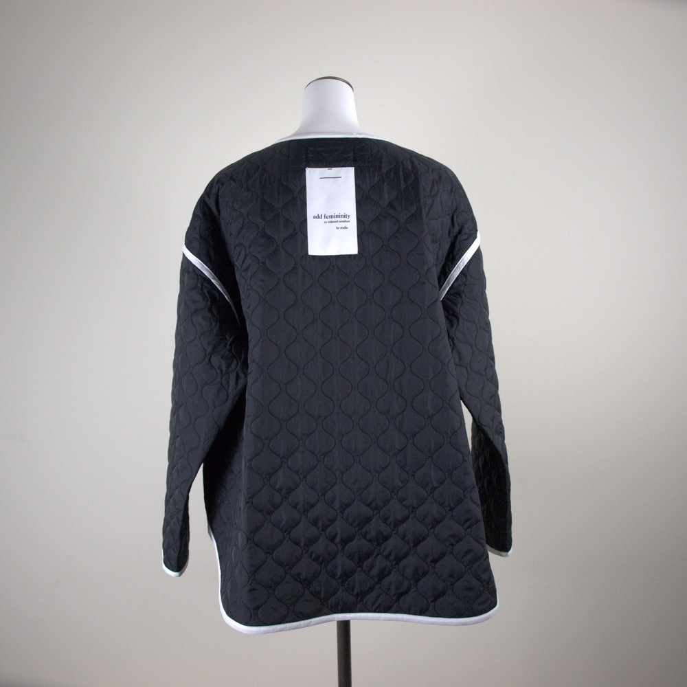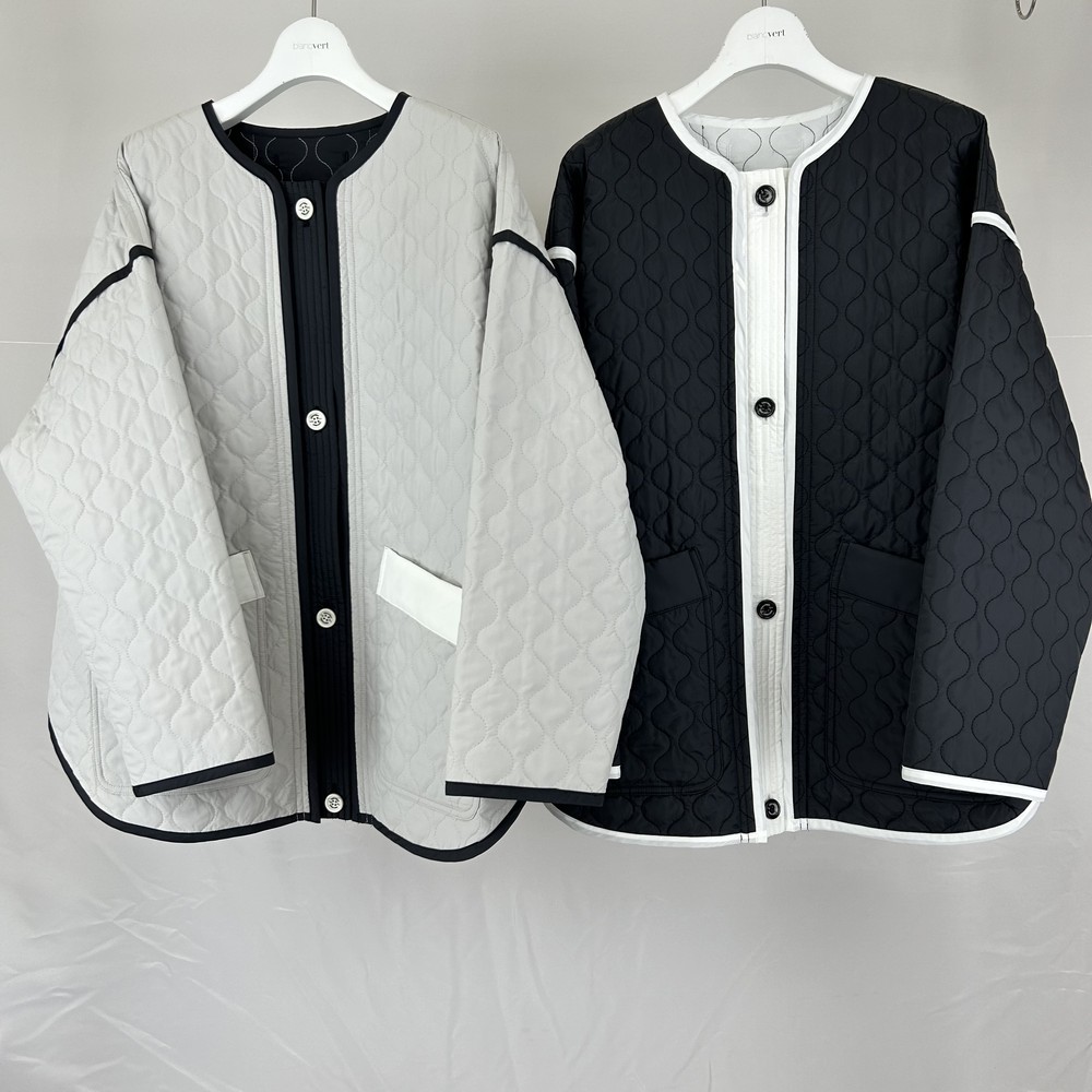 マットなタフタに曲線のキルト加工をした軽めのジャケット。バイカラーでパイピングが映えるオーバーサイズのジャケットは首元を抜き気味にカジュアルに着こなしてこなれた感を。袖口を折り返してインナーを覗かせてもバランス良し。撥水加工/UPF50+