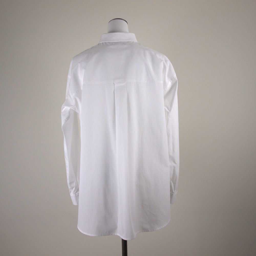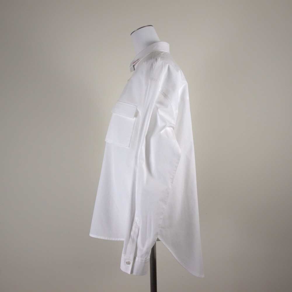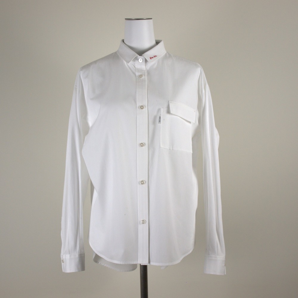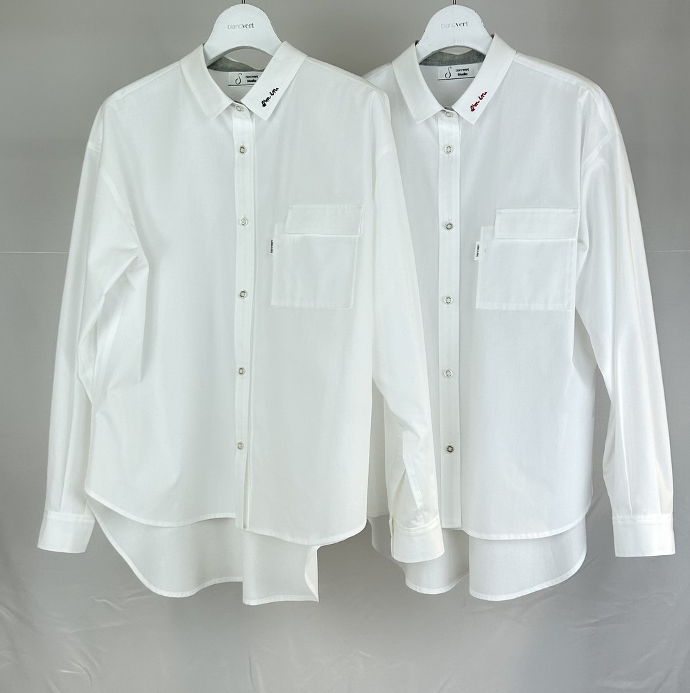 (カタログ掲載)ミドル丈の使い勝手の良いシャツは衿にメッセージロゴ刺繍「I’m in.」いいねと言う意味のロゴを配色で刺しています。衿の刺繍配色での展開です。ポケットのデティールにこだわりあり。