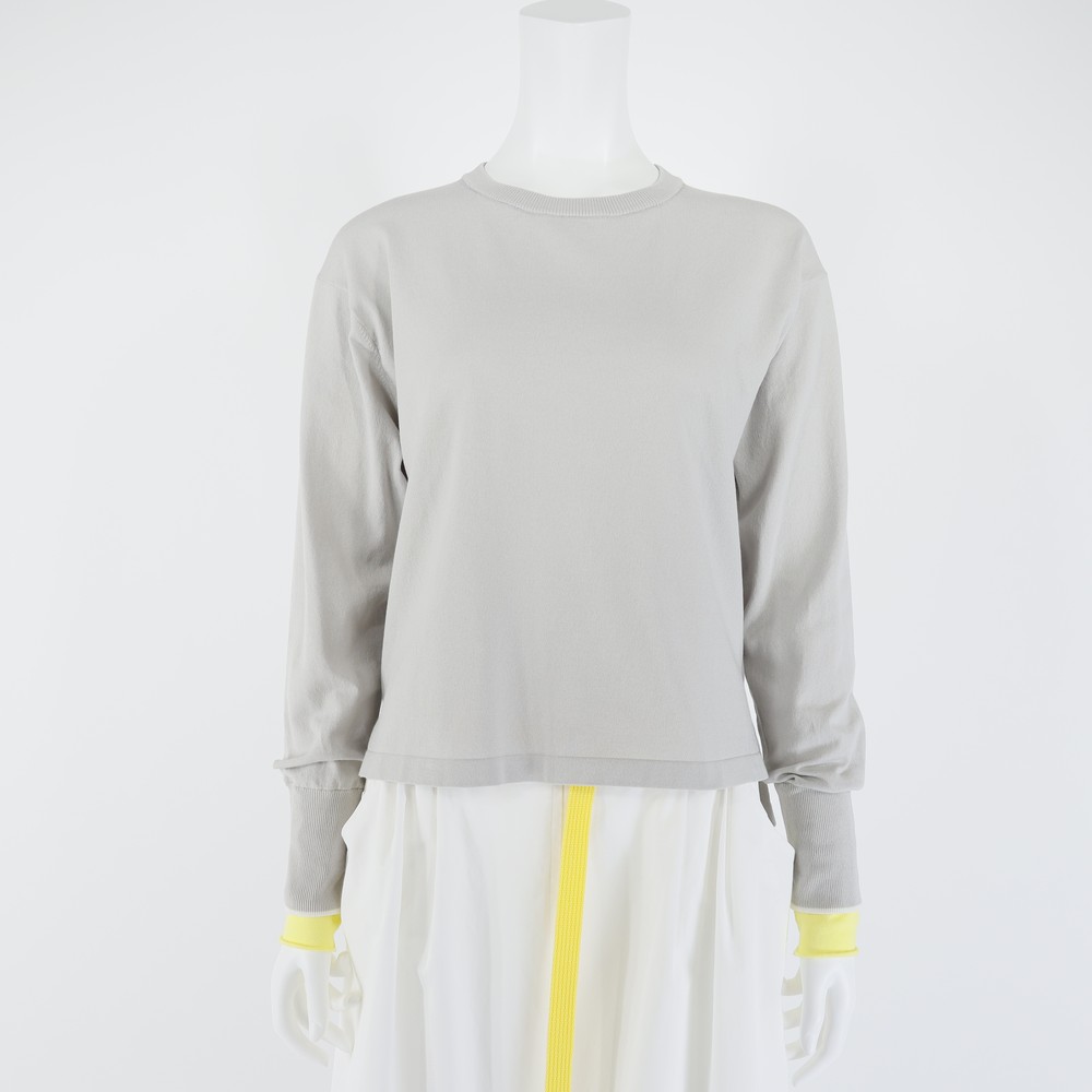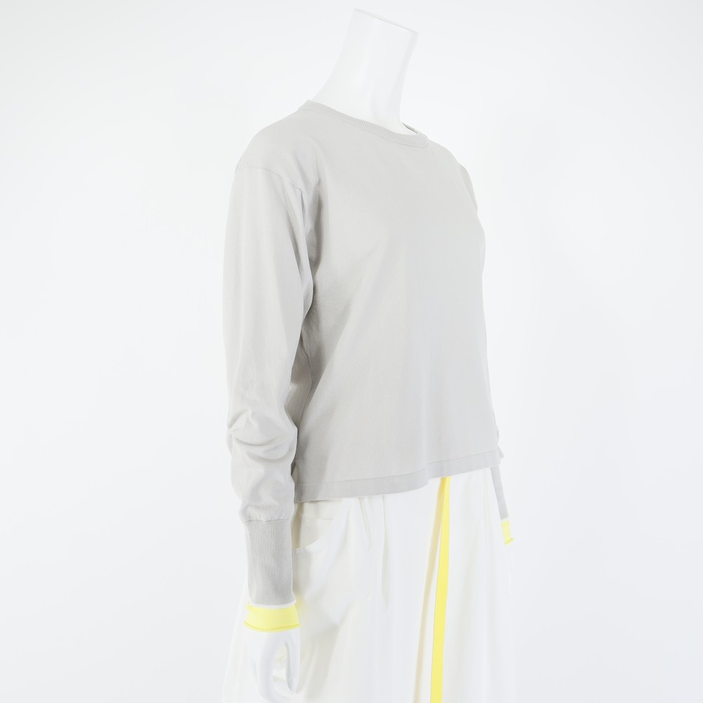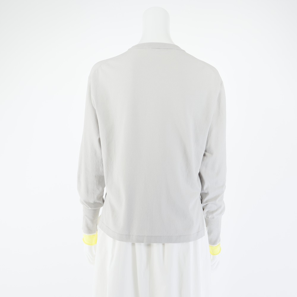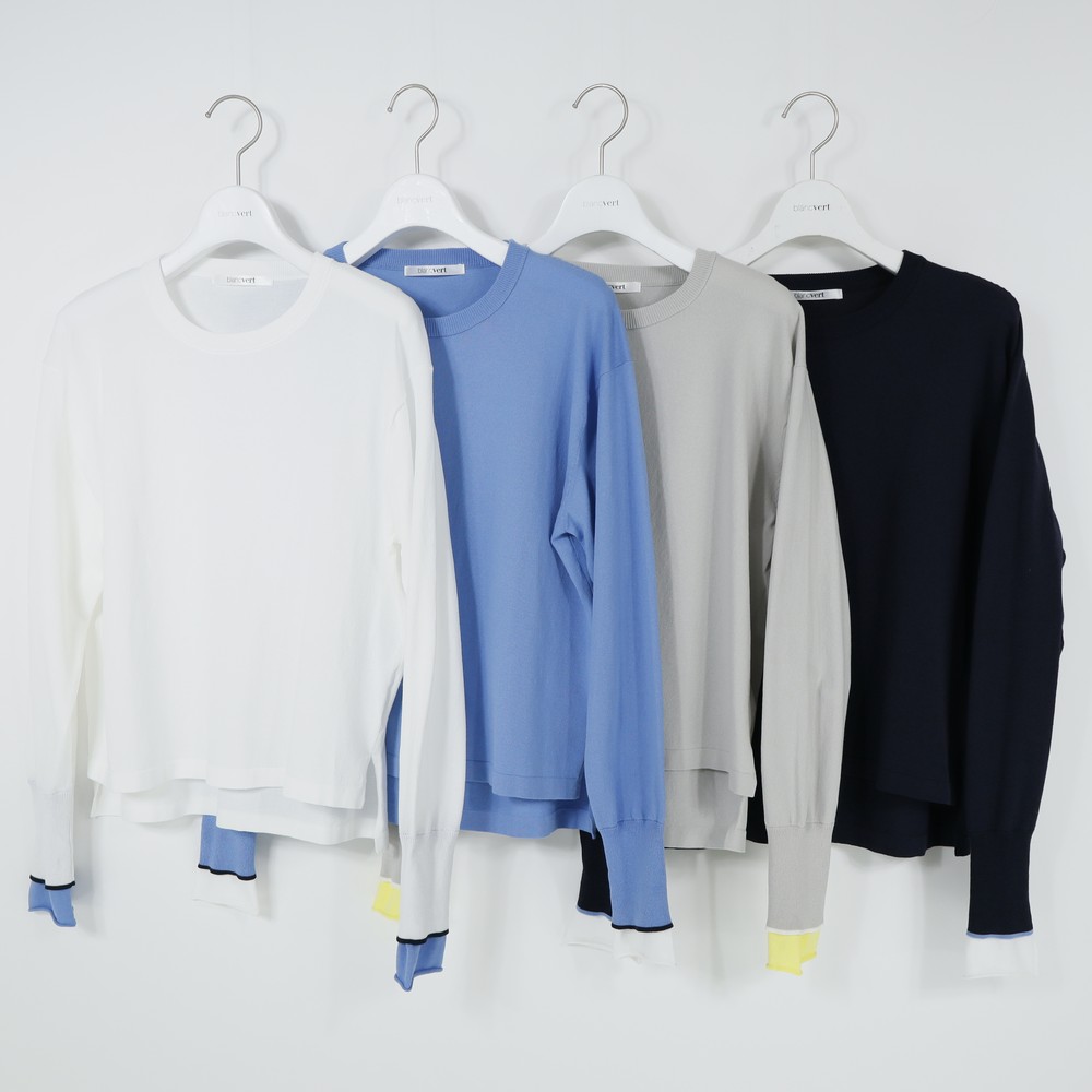 (カタログ掲載)サラッとした肌触りの綿ポリエステル糸をハイゲージで編み立てた肌離れのよいシアーニット。長めの袖口の配色リブは遊び心をプラス。長めに伸ばして茶目っ気スタイルや腕を細見せ効果があるのでこれ1枚でオシャレ感がでます。