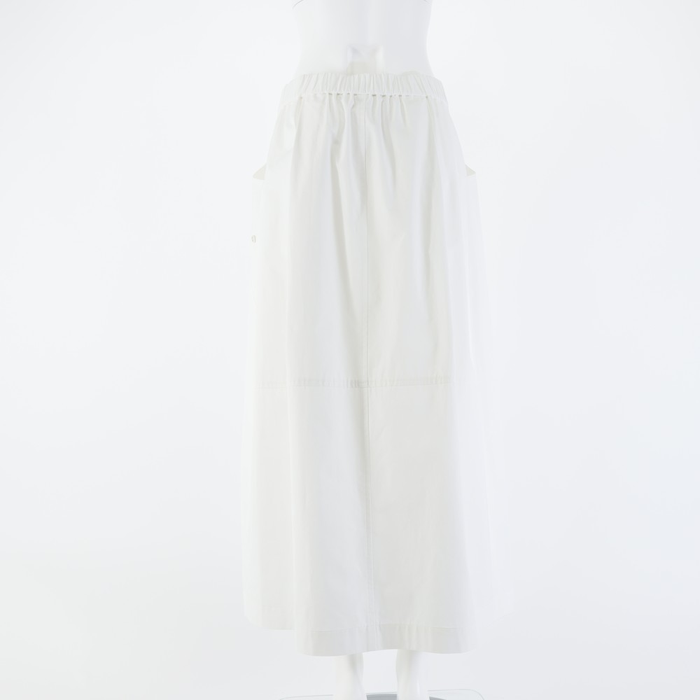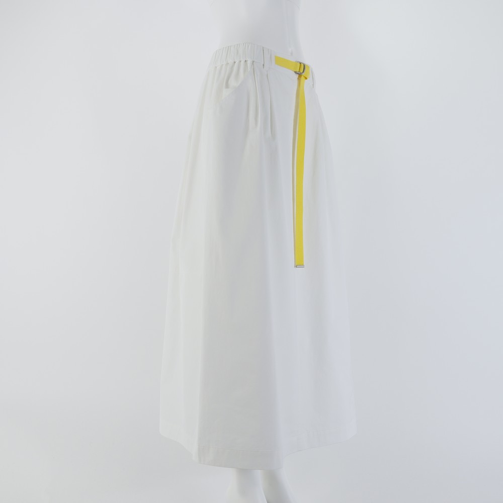 (カタログ掲載)ポリエステルとナイロンの混紡糸使用したバーバリー素材。加工により空気が入り、膨らみとツヤとハリ感が程よい風合いが特徴。前中心以外ウエストゴム使用でコンフォートな仕様。タックとギャザーでボリュームを出し、カラーベルトがデザインポイントのスカート。