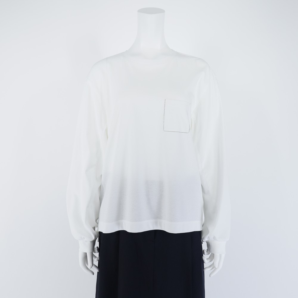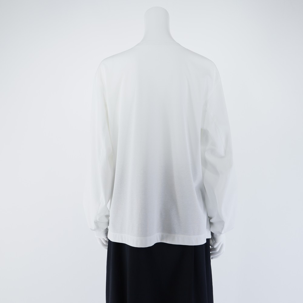 高級スーピマ綿に特殊なバイオ加工を施し、マイルドで滑らかな風合いに仕上げた清涼感のあるドライスムース使用した立体的なボリューム袖のクルーカットソー。ポケット周りのボールチェーンがポイント。