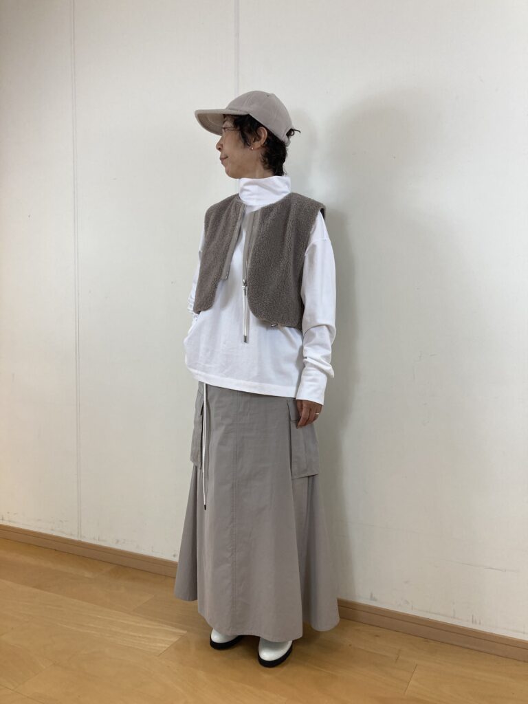 ロングベストとドット柄のロングスカートの縦長のラインを活かしたコーディネイト。 POINT//良質素材のロングベストは羽織りとしてもベストワンピースとしても楽しめるアイテム
