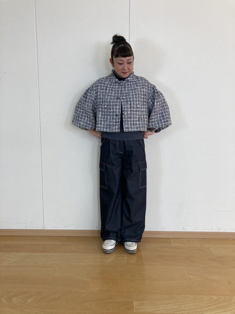 ツィードジャケット×デニムカーゴパンツ